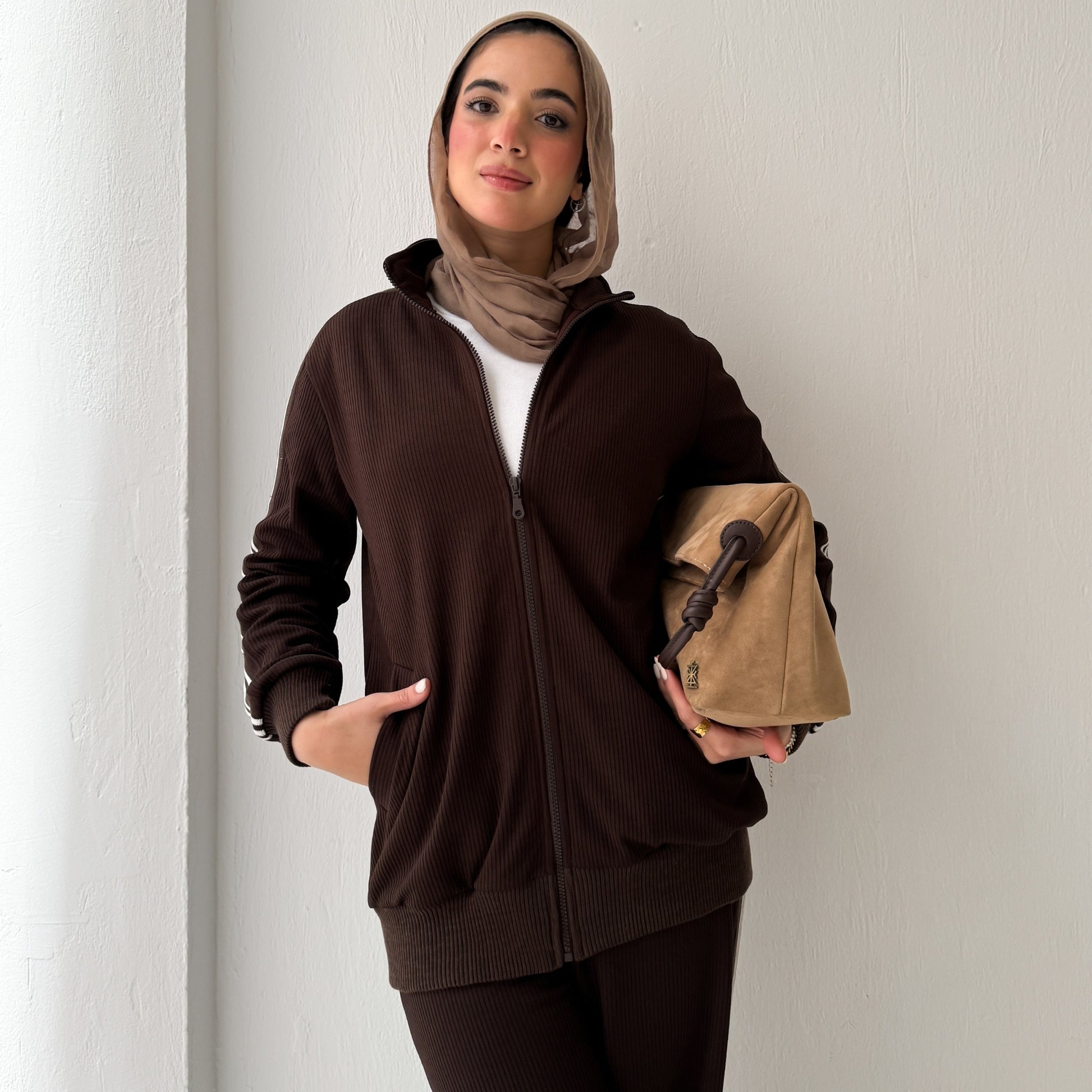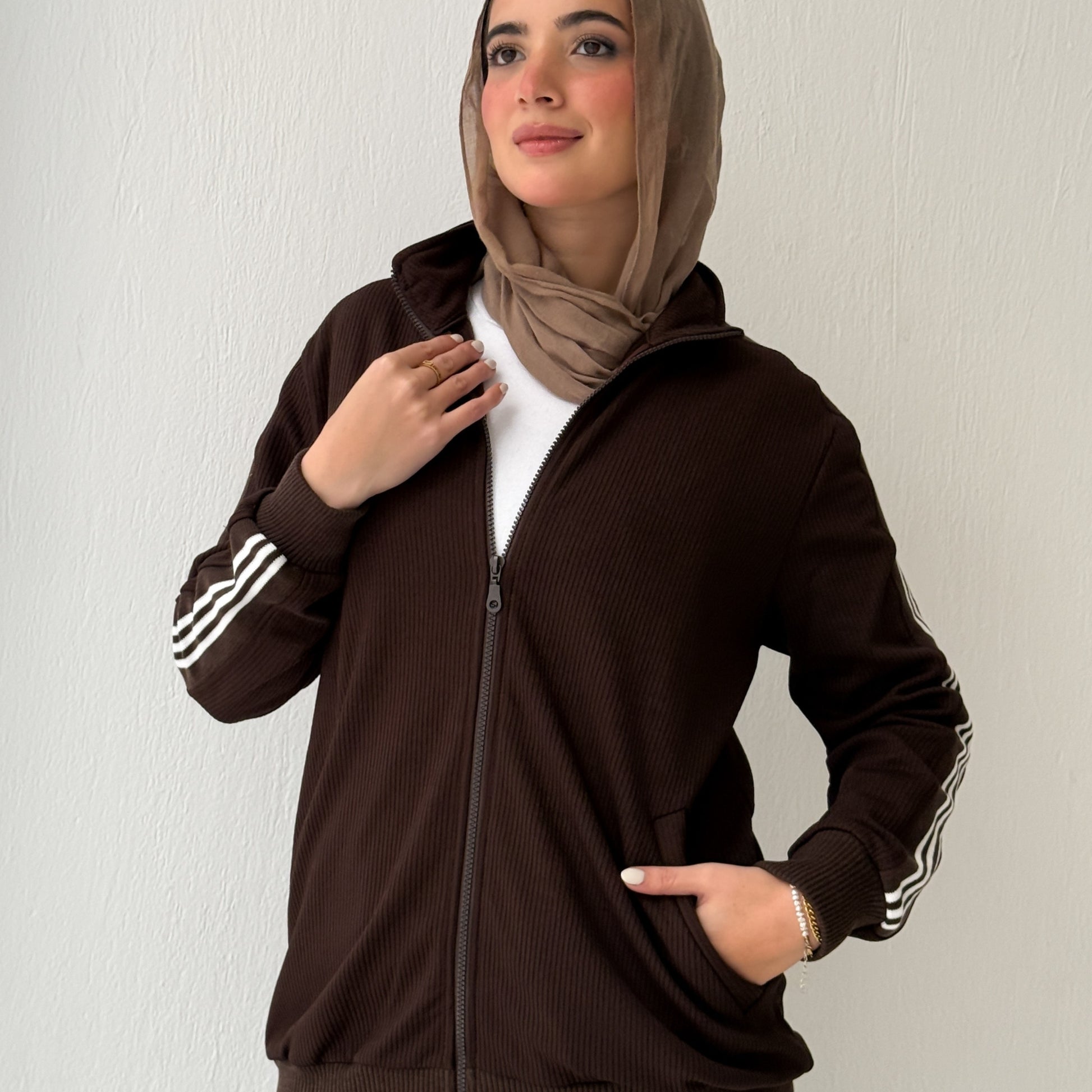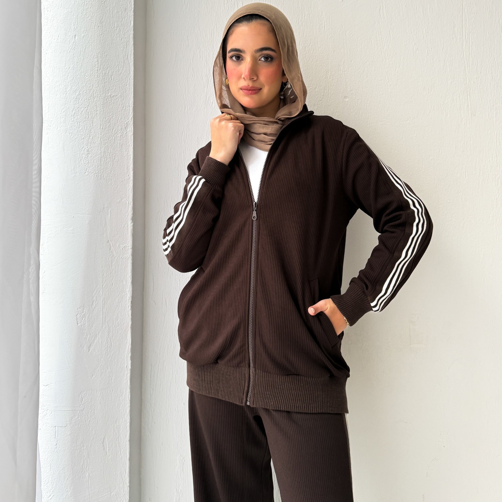 A clean, elevated set made from ribbed winter cotton with white stripes on the shoulders.